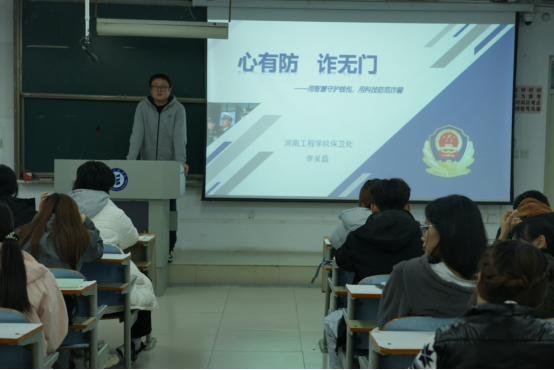 为切实提升学生安全防范意识与应急处置能力,11月12日至13日,保卫处处长李吴磊先后走进龙湖校区、桐柏路校区,围绕电信诈骗防范与消防安全两大核心主题,为两校区学生开展专题安全教育课,将安全知识精准传递至校园一线。